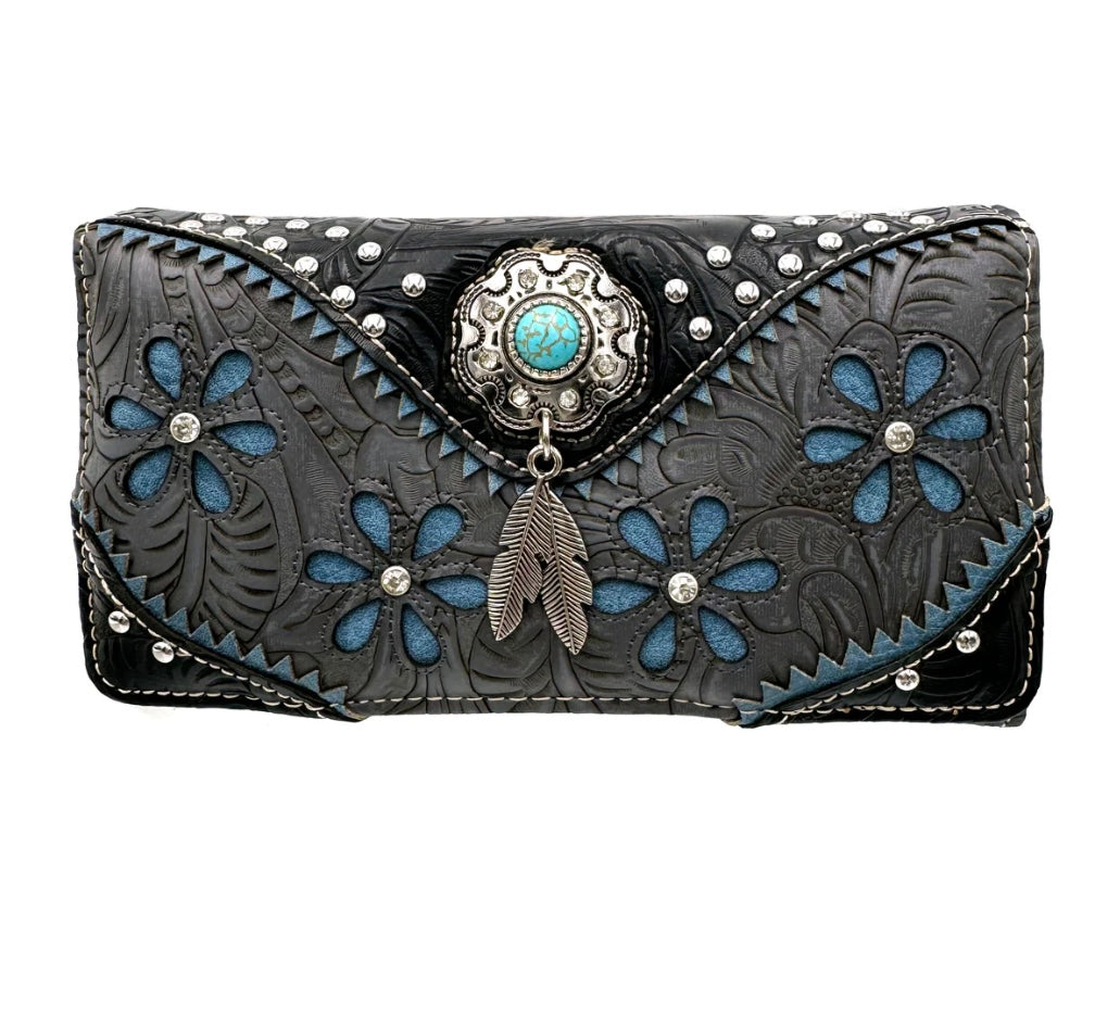Bessie Turquoise Concho Feather Western Crossbody Wallet, a wallet featuring beautiful berry concho decorated by feathers, rhinestones with western floral prints.