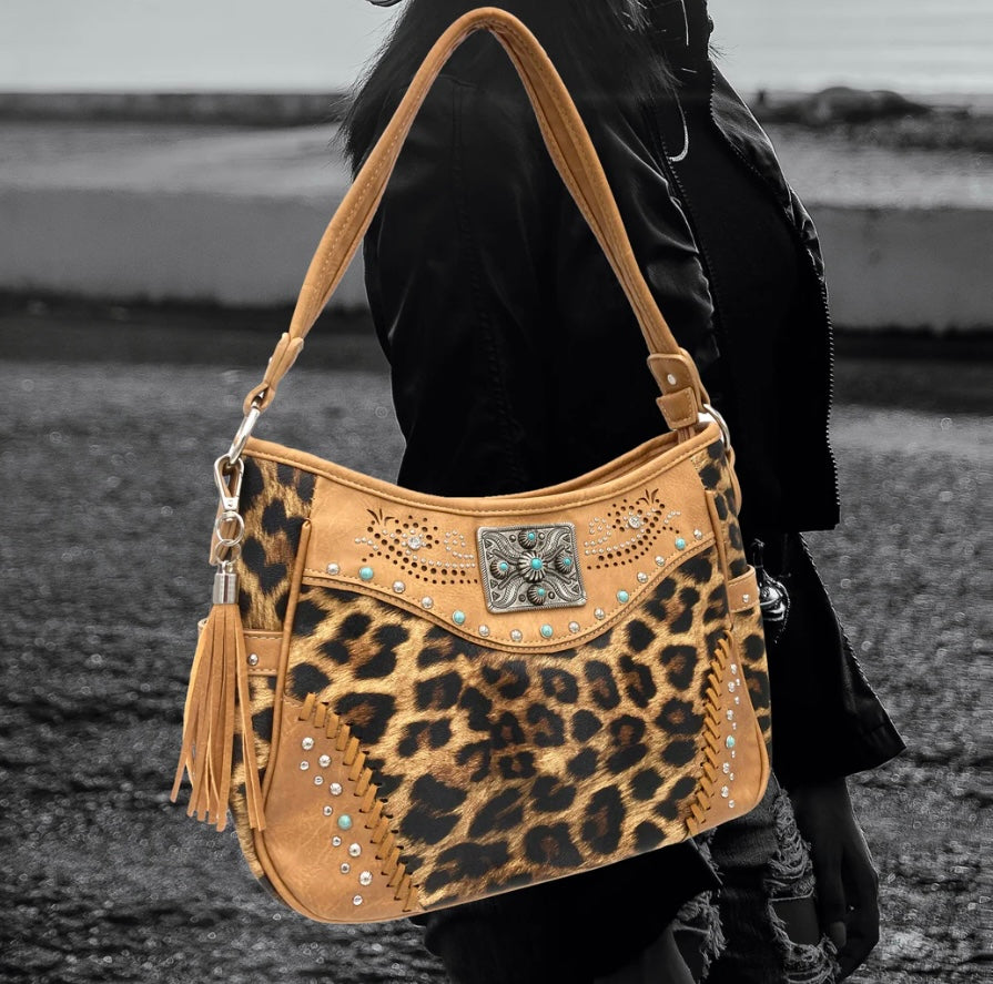 Introducing our Leopard Spots Western Leather Handbag Hobo Bag, a purse in a shape of a hobo bag. Crafted from premium PU Vegan faux leather, our Women's Embroidered Horse Western Backpack replicates the luxurious look and feel of genuine leather at an affordable price.