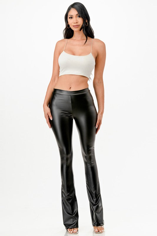 High waist PU leather fitted thighs bell bottom flare-leg pants
