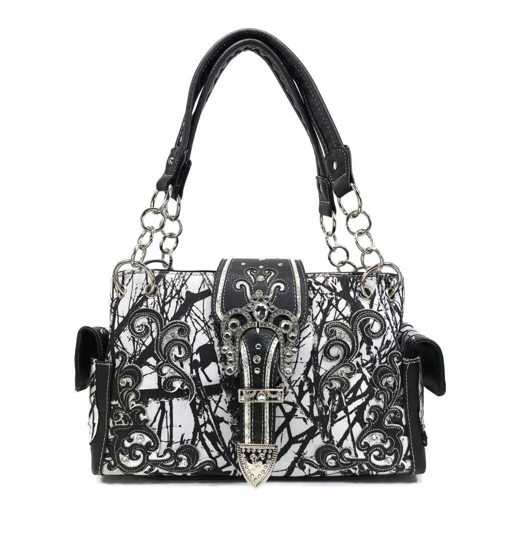 Introducing the Rhinestone Buckle Branch Camouflage Women's Handbag Purse, expertly designed for women seeking both style and functionality. Designed with a rhinestone filled belt buckle with magnetic snap closure, this handbag adds a touch of elegance to any outfit.