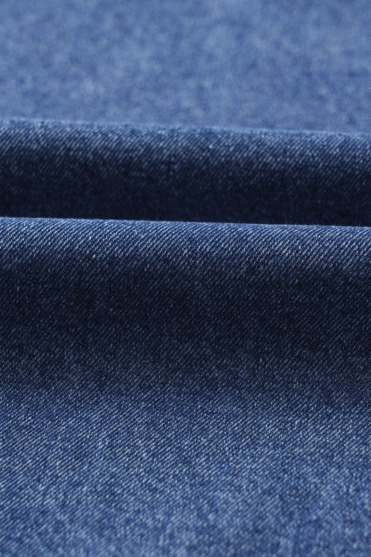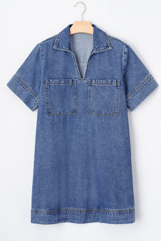 This playful denim mini dress combines breezy comfort with casual charm. The short sleeves and relaxed fit keep it cool and easygoing, while the classic collared neckline adds a timeless touch. Feminine V-neck details meet practical patched chest pockets for a fun, utilitarian vibe perfect for everyday adventures. Cotton/Polyester/Viscose