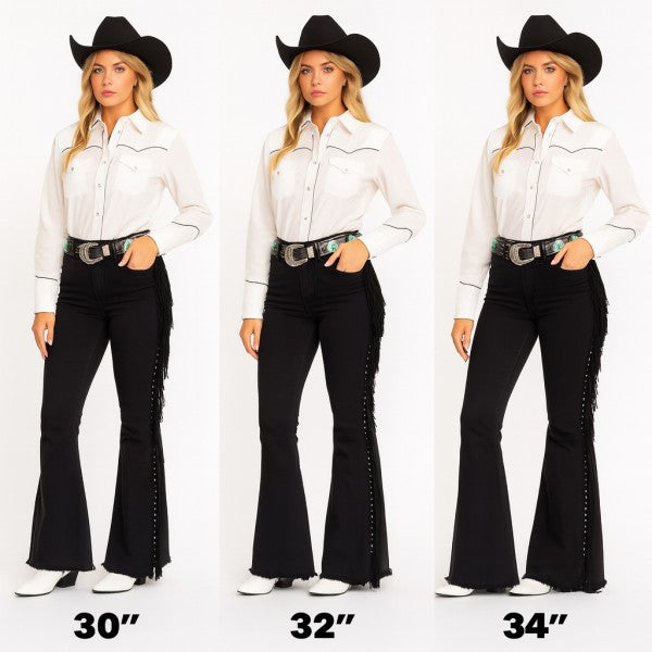 Get ready to rock your style with our Fringe Bell Bottom Jean in our Updated Black Denim! These USA-made jeans have functional pockets, a zipper and button front closure, and a cool suede fringe tassel detail on the sides. With 3 inseam lengths to choose from, you can find the perfect fit. Trust us, you won't be disappointed!