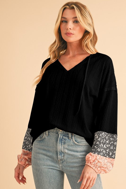 Floral Patchwork Textured Drawstring V Neck Top
