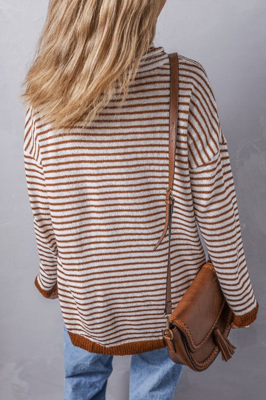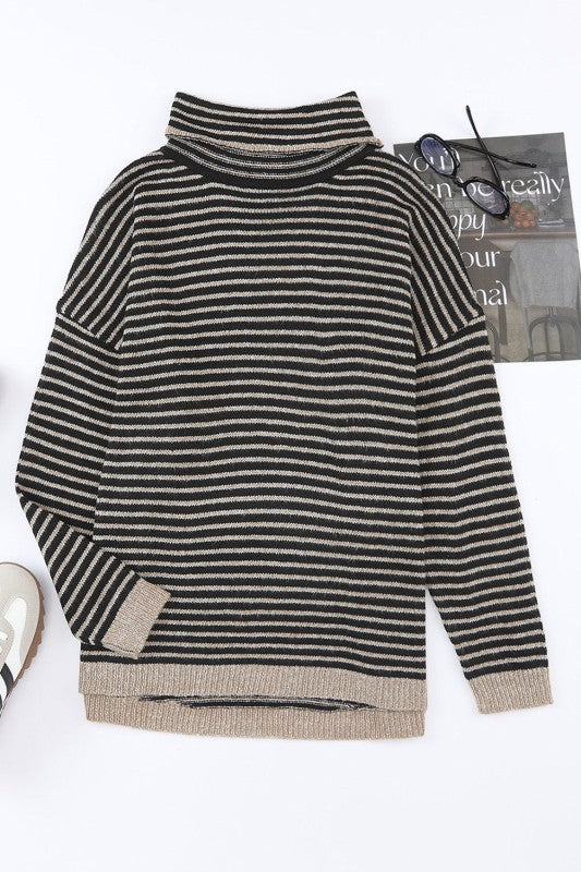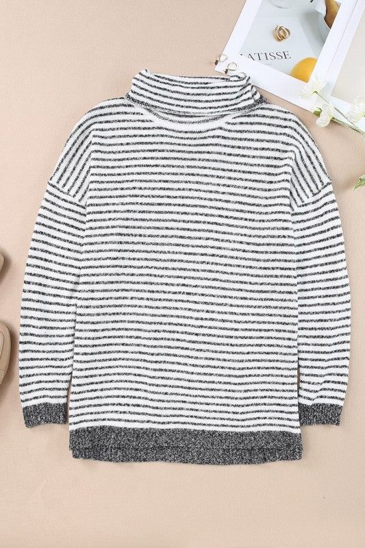 Stay warm and stylish with this knit sweater featuring a timeless turtleneck design in a classic striped pattern. The loose fit adds a cozy touch to any outfit, perfect for those chilly days.