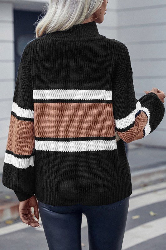 Features: Half Zipper Strip Knit Loose Fit Sweater