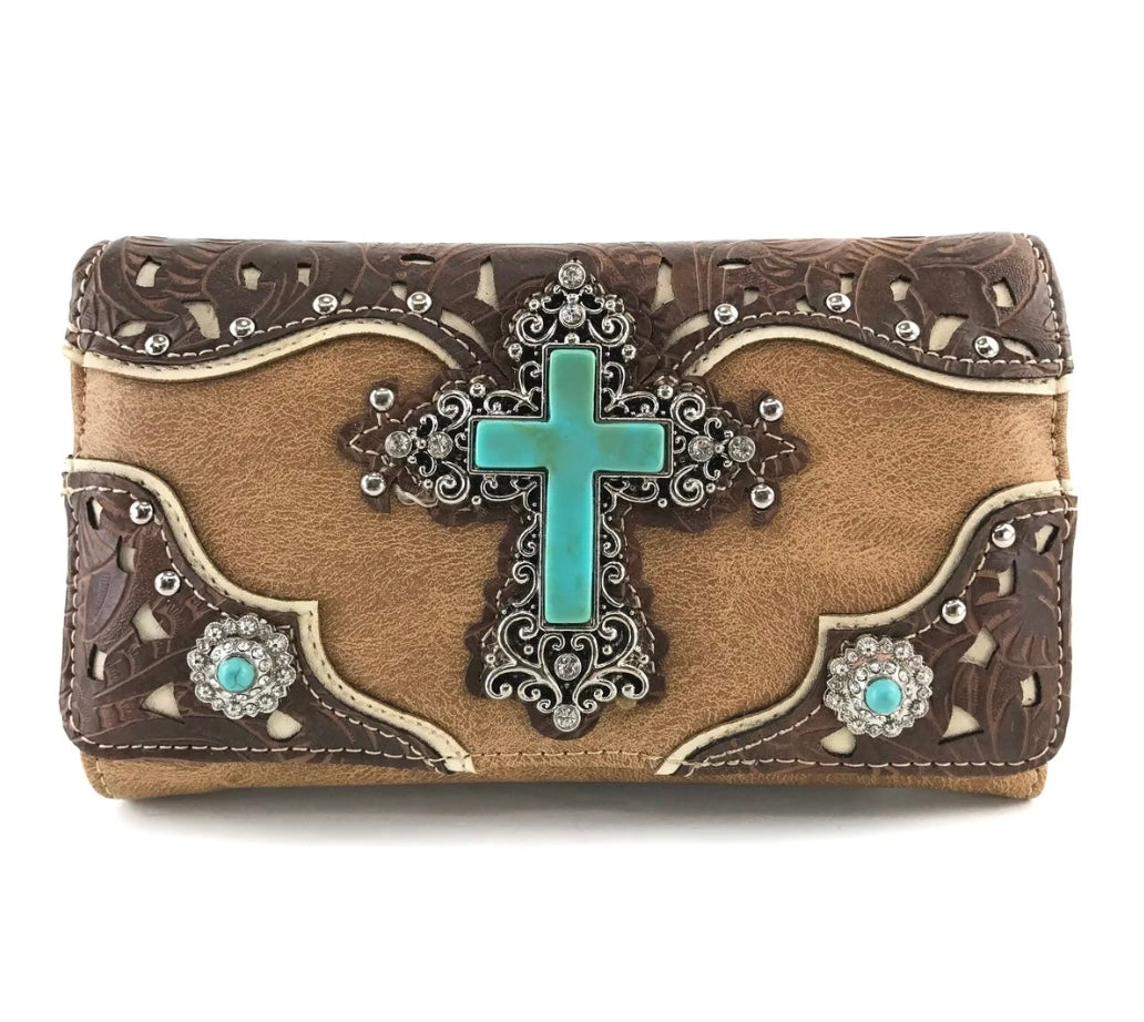 Turquoise Cross PuLeather Western Crossbody Wallet