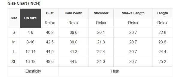 See size chart for approximate measurements.